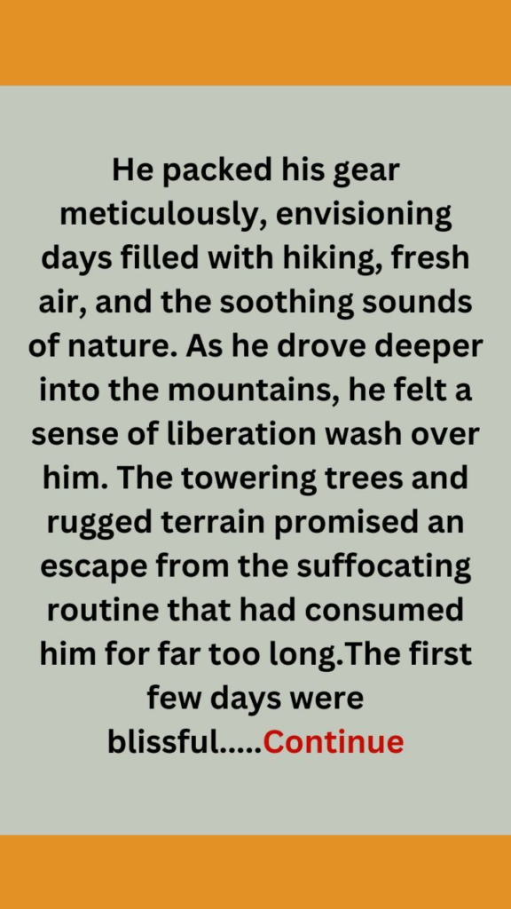 Mark had spent the last two decades confined within the sterile walls of a corporate office, his life dictated by endless meetings, deadlines, and the fluorescent hum of overhead lights. The monotony had worn him down, leaving him yearning for something more than the daily grind. So, with a mix of excitement and trepidation, he decided to take all his vacation and sick days at once for an excursion in the Appalachian Mountains.He packed his gear meticulously, envisioning days filled with hiking, fresh air, and the soothing sounds of nature. As he drove deeper into the mountains, he felt a sense of liberation wash over him. The towering trees and rugged terrain promised an escape from the suffocating routine that had consumed him for far too long.The first few days were blissful. Mark hiked through lush forests, breathed in crisp mountain air, and marveled at breathtaking vistas. Each step felt like shedding layers of stress, and he reveled in the solitude that surrounded him. But on the fourth day, as he set out for a new trail, dark clouds began to gather ominously overhead.