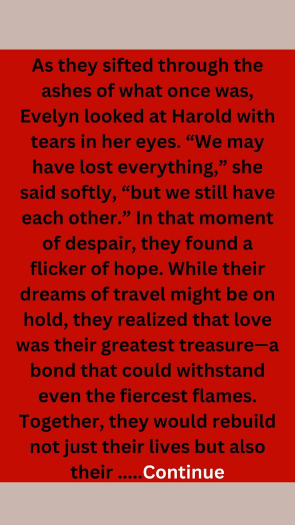 As they sifted through the ashes of what once was, Evelyn looked at Harold with tears in her eyes. “We may have lost everything,” she said softly, “but we still have each other.” In that moment of despair, they found a flicker of hope. While their dreams of travel might be on hold, they realized that love was their greatest treasure—a bond that could withstand even the fiercest flames. Together, they would rebuild not just their lives but also their dreams for the future.