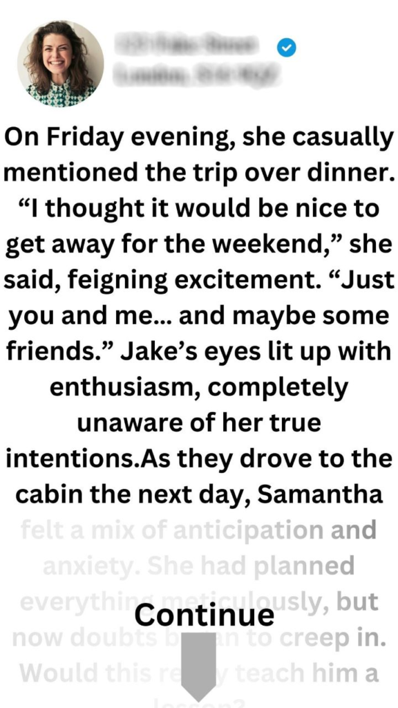 On Friday evening, she casually mentioned the trip over dinner. “I thought it would be nice to get away for the weekend,” she said, feigning excitement. “Just you and me… and maybe some friends.” Jake’s eyes lit up with enthusiasm, completely unaware of her true intentions.As they drove to the cabin the next day, Samantha felt a mix of anticipation and anxiety. She had planned everything meticulously, but now doubts began to creep in. Would this really teach him a lesson?Once they arrived at the cabin, Samantha set her plan into motion. She “accidentally” left her phone behind at home to create a sense of isolation. As night fell and they gathered around the fire with their friends, she subtly steered conversations toward loyalty and trust.
