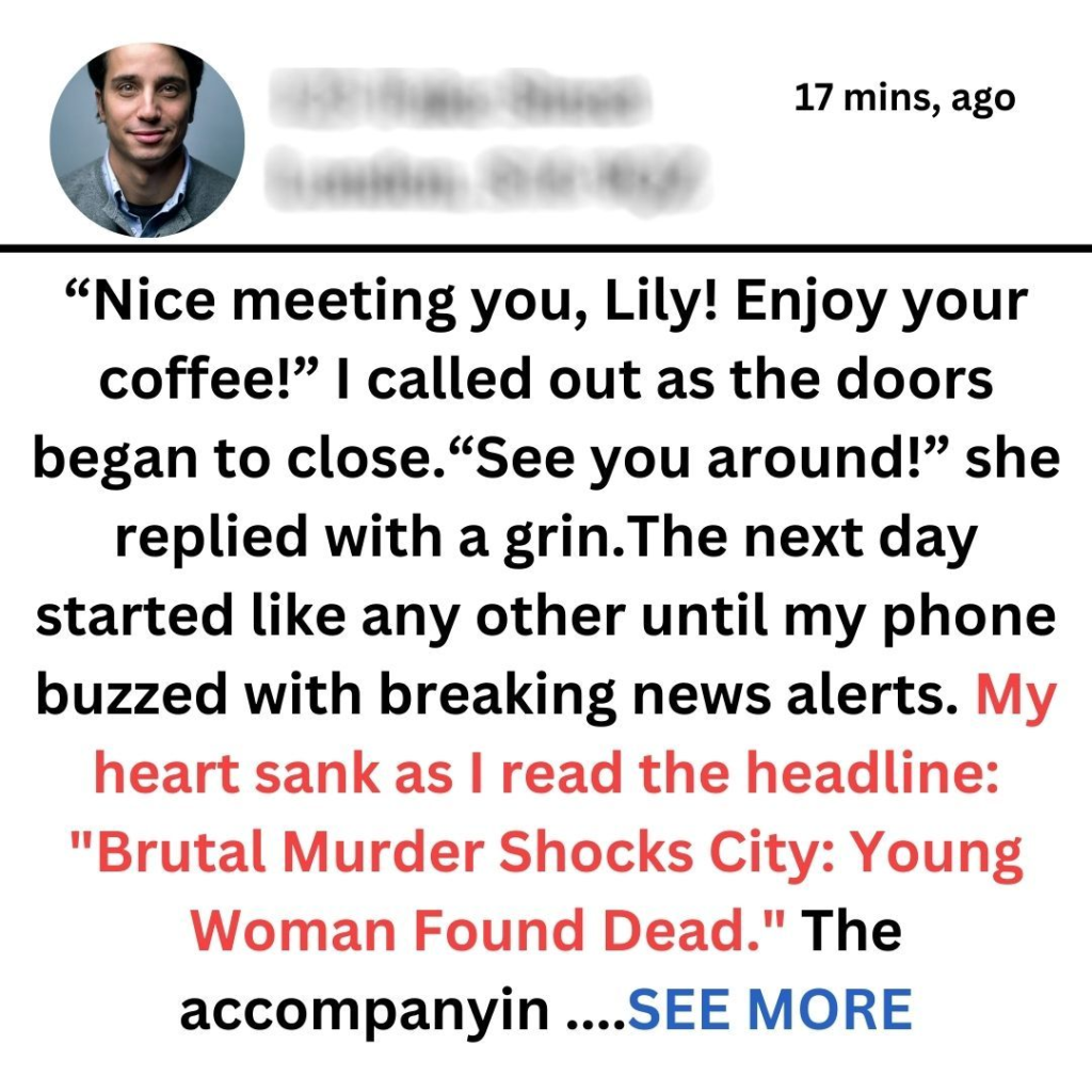 The next day started like any other until my phone buzzed with breaking news alerts. My heart sank as I read the headline: “Brutal Murder Shocks City: Young Woman Found Dead.” The accompanying photo made my stomach churn—it was Lily, the vibrant stranger from the elevator.Details flooded in: she had been found murdered in her apartment, and police were investigating potential leads. My mind raced back to our brief encounter—her laughter, her warmth—and now she was gone, a victim of violence that shattered the normalcy of everyday life.