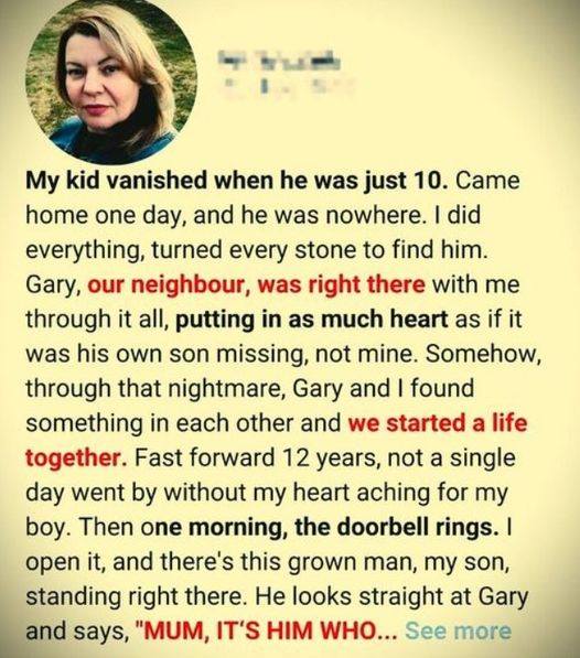 Gary was there through it all, his steadfast support helping me cope with the crushing weight of not knowing what had happened to my son. Our existence together was founded on shared grief, as well as hope and love. Then one morning, the doorbell rang. I wasn’t expecting anyone, so I rushed to respond, an odd feeling sitting in my chest. When I opened the door, my heart almost stopped.
