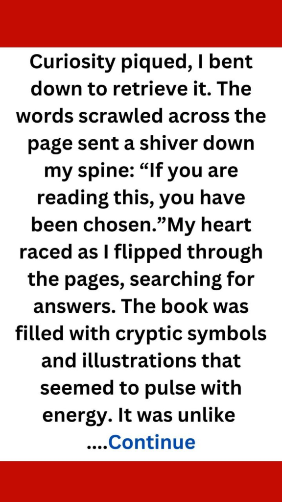 My heart raced as I flipped through the pages, searching for answers. The book was filled with cryptic symbols and illustrations that seemed to pulse with energy. It was unlike anything I had ever encountered—a blend of ancient lore and modern mystery. As I read further, I discovered that the book detailed a series of tasks and challenges meant for those who had been “chosen.”Each task promised rewards beyond imagination: knowledge, power, even glimpses into alternate realities. But there was also a warning: failure to complete them would come at a cost. My mind raced with possibilities. Was this real? Could I really be chosen for something greater?As I contemplated my next move, an electric thrill coursed through me. This could be an adventure unlike any other—a chance to step outside the mundane and into a world of wonder and danger. But what did it mean to be “chosen”?