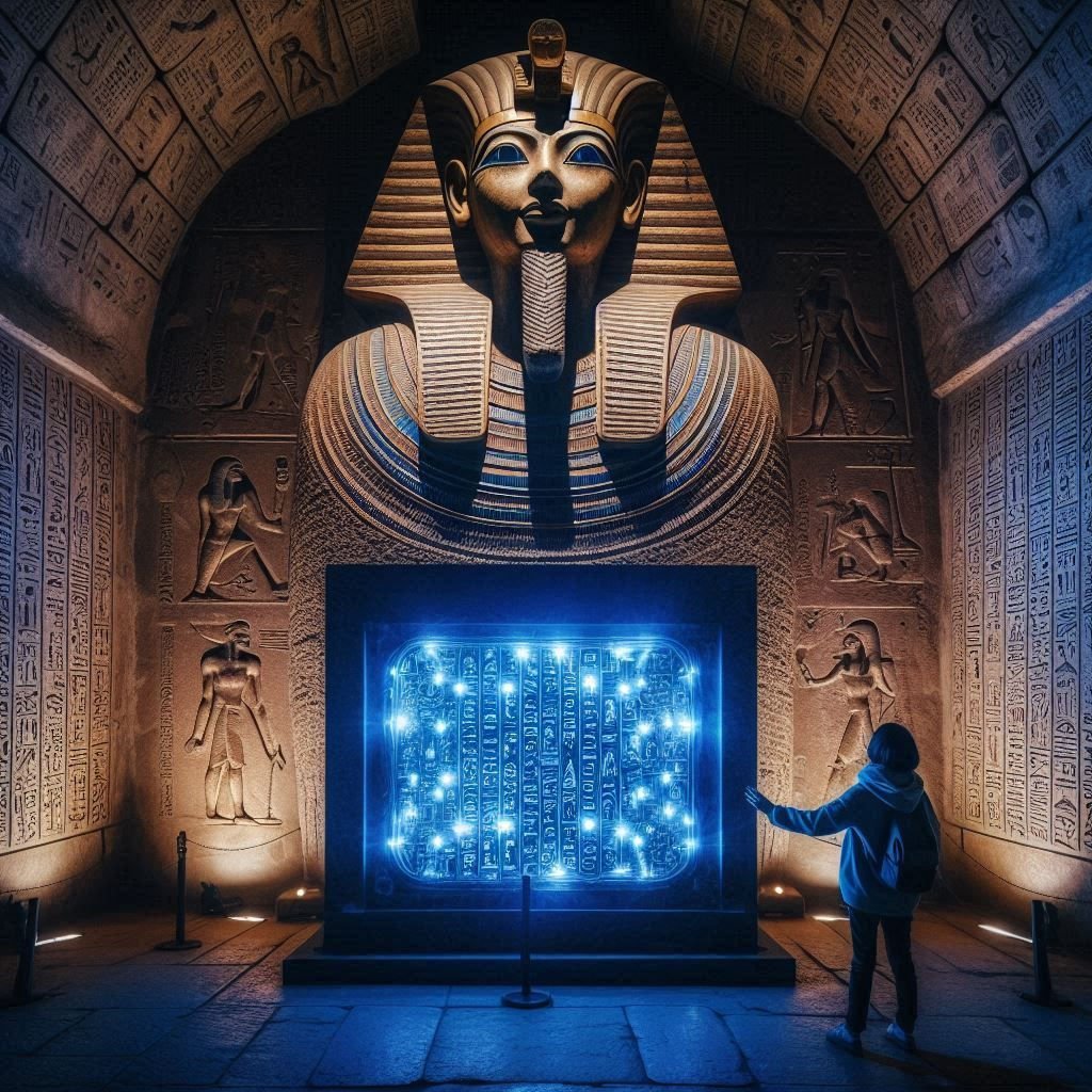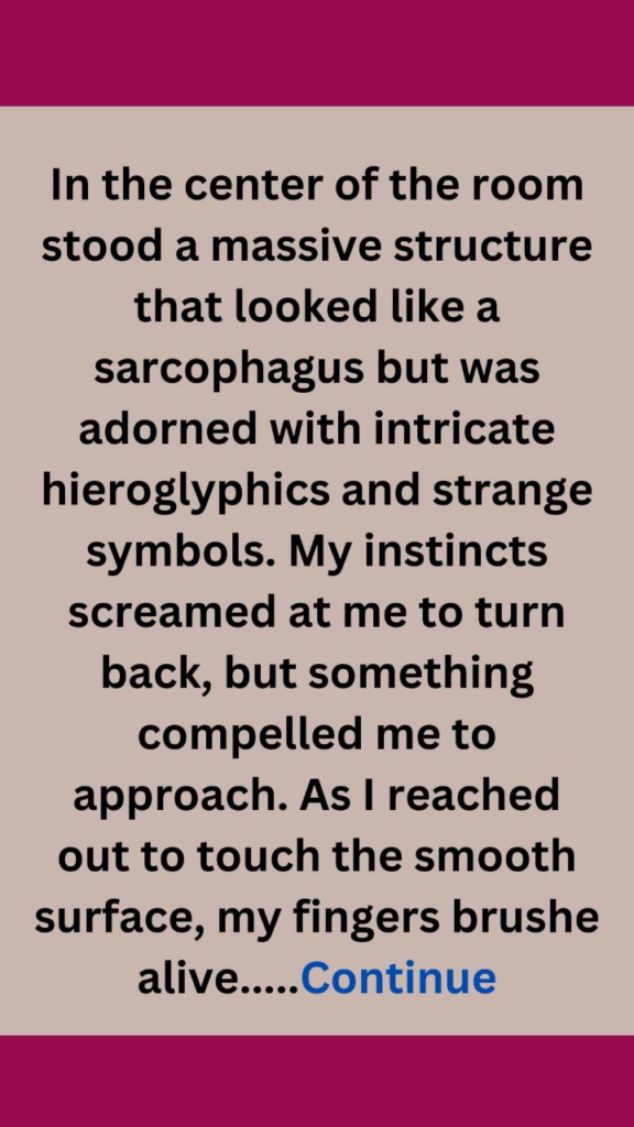 As I stepped into the shadow of the Great Pyramid of Giza, I couldn’t shake the feeling that I was walking into a piece of history. The sun blazed overhead, casting long shadows that danced across the ancient stones. I had always been fascinated by ancient Egypt, but today felt different. Today, I was not just a tourist; I was a seeker of secrets.After exploring the base of the pyramid, I noticed a narrow entrance partially hidden by sand. My curiosity piqued, I ducked inside, heart racing with anticipation. The air was cool and musty, filled with the scent of ancient stone. As I ventured deeper into the pyramid’s interior, I stumbled upon a large chamber illuminated by an eerie blue glow.In the center of the room stood a massive structure that looked like a sarcophagus but was adorned with intricate hieroglyphics and strange symbols. My instincts screamed at me to turn back, but something compelled me to approach. As I reached out to touch the smooth surface, my fingers brushed against a panel that felt oddly warm.