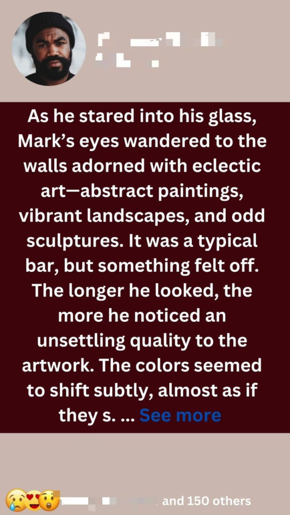 Detective Mark Reynolds sat alone at the bar, nursing a whiskey as he contemplated his impending retirement. After thirty years on the force, the weight of his badge felt heavier than ever. The dimly lit bar was a refuge from the chaos of the world outside, a place where he could reflect on a career filled with both triumphs and regrets.As he stared into his glass, Mark’s eyes wandered to the walls adorned with eclectic art—abstract paintings, vibrant landscapes, and odd sculptures. It was a typical bar, but something felt off. The longer he looked, the more he noticed an unsettling quality to the artwork. The colors seemed to shift subtly, almost as if they were alive.Suddenly, he blinked and leaned closer. The paintings morphed before his eyes, revealing chilling images of serial killers from the last twenty years. Faces he recognized flashed across the canvases—monsters he had studied during countless late nights at the precinct. His heart raced as he realized these weren’t just random pieces of art; they were a gallery of horror.