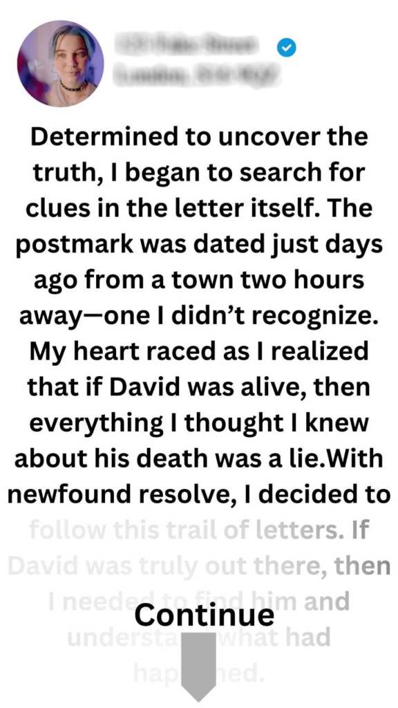 Trembling, I tore open the envelope and unfolded the letter inside. “My dearest Claire,” it began, and my breath caught in my throat. The words flowed like they always had, filled with love and warmth. He spoke of his longing for me, of the beauty he saw in our shared memories, and how he wished he could be there to comfort me through my pain.Confusion washed over me. How could this be? David was gone. I had buried him; I had mourned him. Yet here were his words, reaching out from beyond the grave.I read on, each sentence pulling me deeper into a whirlwind of emotions—joy intertwined with disbelief. Was this some sort of supernatural phenomenon? Had I lost my mind? Or could it be that someone was playing an elaborate trick on me?Determined to uncover the truth, I began to search for clues in the letter itself. The postmark was dated just days ago from a town two hours away—one I didn’t recognize. My heart raced as I realized that if David was alive, then everything I thought I knew about his death was a lie.