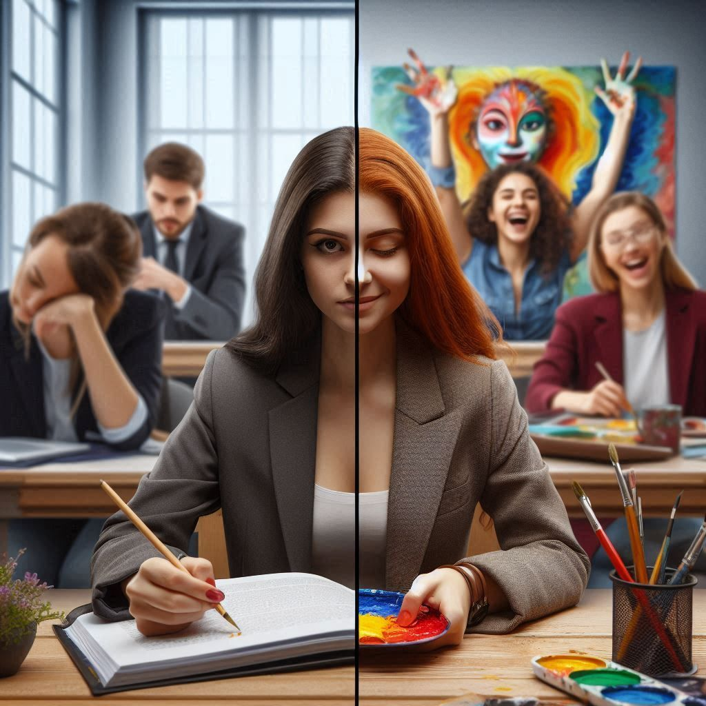 Maya stood on the campus of Crestwood University, her heart racing with a mix of excitement and anxiety. She had followed the path laid out for her since childhood: study hard, get good grades, and secure a spot at a prestigious college. Her parents had always emphasized the importance of a reliable career, and she was now enrolled in a business program that promised stability and success. But as she walked through the vibrant campus, surrounded by students passionately discussing their dreams, something inside her began to stir.The first few weeks were a whirlwind of lectures and assignments, but Maya couldn’t shake the feeling that she was meant for something more. One evening, while exploring the campus, she stumbled upon an art studio filled with colorful canvases and lively chatter. Intrigued, she stepped inside and was immediately captivated by the energy of creativity that filled the room. Students were painting, sculpting, and sharing ideas, their faces alight with passion.