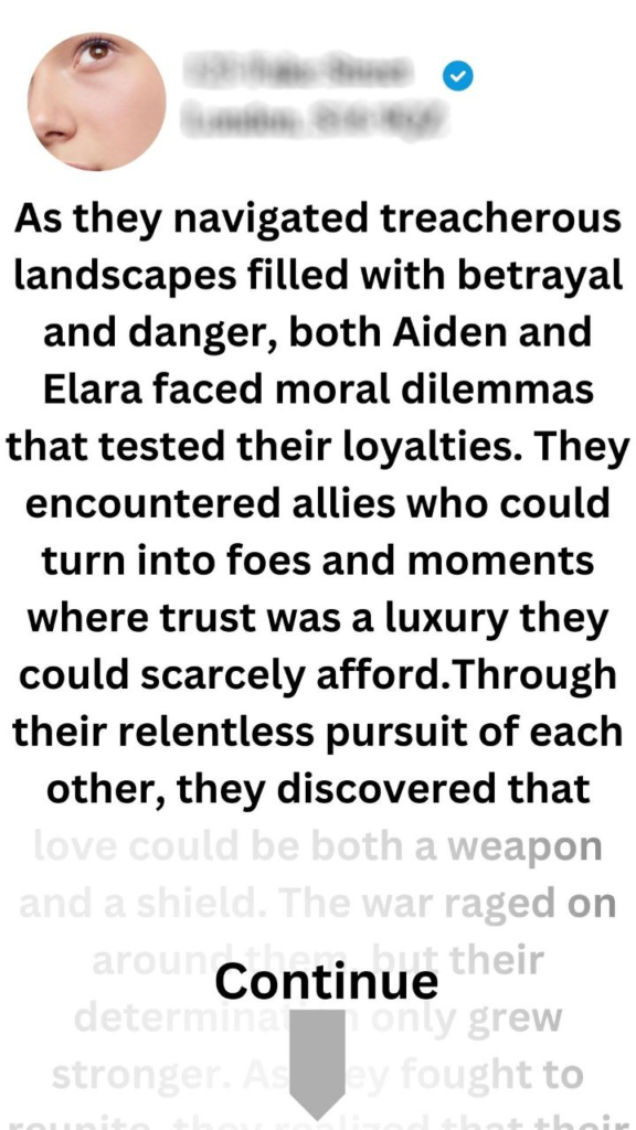 Determined to reunite against all odds, both Aiden and Elara embarked on separate journeys filled with peril. Aiden used his cunning to manipulate military strategies from within the ranks of Lorian’s forces. He gathered intel on enemy movements while secretly searching for any sign of Elara.Elara, on the other hand, tapped into her artistic talents to forge documents that would allow her to infiltrate enemy camps disguised as a healer. She sought information about Aiden’s whereabouts while using her charm to gain allies among those who could help her.As they navigated treacherous landscapes filled with betrayal and danger, both Aiden and Elara faced moral dilemmas that tested their loyalties. They encountered allies who could turn into foes and moments where trust was a luxury they could scarcely afford.Through their relentless pursuit of each other, they discovered that love could be both a weapon and a shield. The war raged on around them, but their determination only grew stronger. As they fought to reunite, they realized that their love was not just a bond; it was a force powerful enough to challenge fate itself.