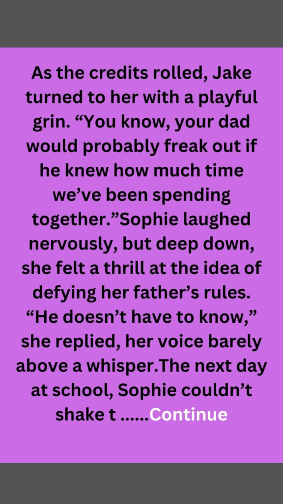 One evening, while her dad was out running errands, Sophie and Jake ended up in the living room together, watching a movie. The air was thick with unspoken tension, and Sophie felt her heart race as she caught him glancing at her when he thought she wasn’t looking. It was exhilarating yet terrifying; she knew she shouldn’t feel this way about someone who was technically off-limits.As the credits rolled, Jake turned to her with a playful grin. “You know, your dad would probably freak out if he knew how much time we’ve been spending together.”Sophie laughed nervously, but deep down, she felt a thrill at the idea of defying her father’s rules. “He doesn’t have to know,” she replied, her voice barely above a whisper.The next day at school, Sophie couldn’t shake the feeling that something had shifted between them. They exchanged glances in the hallways and shared secret smiles that made her heart flutter. It was exhilarating to think that they were dancing around the edges of something forbidden.But as much as she wanted to explore this connection with Jake, the weight of her father’s rules loomed large in her mind. She knew that crossing this line could lead to trouble—trouble she wasn’t sure she was ready for.