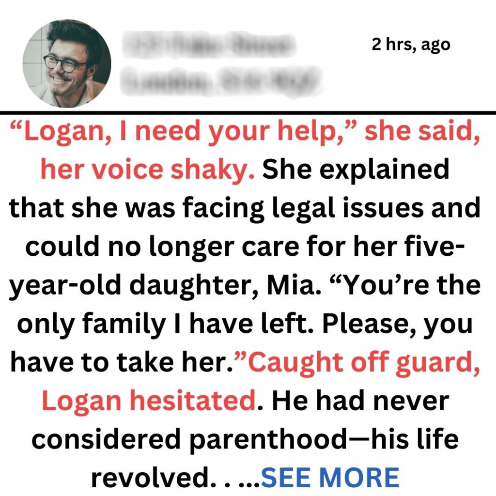 Logan Hayes was the quintessential playboy. With his charming smile, flashy car, and a lifestyle filled with parties and late-night escapades, he thrived on the thrill of being young and free. His friends often joked that he would never settle down, and he took pride in that reputation. However, everything changed one fateful afternoon when he received a call from his estranged sister.“Logan, I need your help,” she said, her voice shaky. She explained that she was facing legal issues and could no longer care for her five-year-old daughter, Mia. “You’re the only family I have left. Please, you have to take her.”Caught off guard, Logan hesitated. He had never considered parenthood—his life revolved around himself and his pursuits. But with little choice, he reluctantly agreed to take Mia in, thinking it would be a temporary arrangement.
