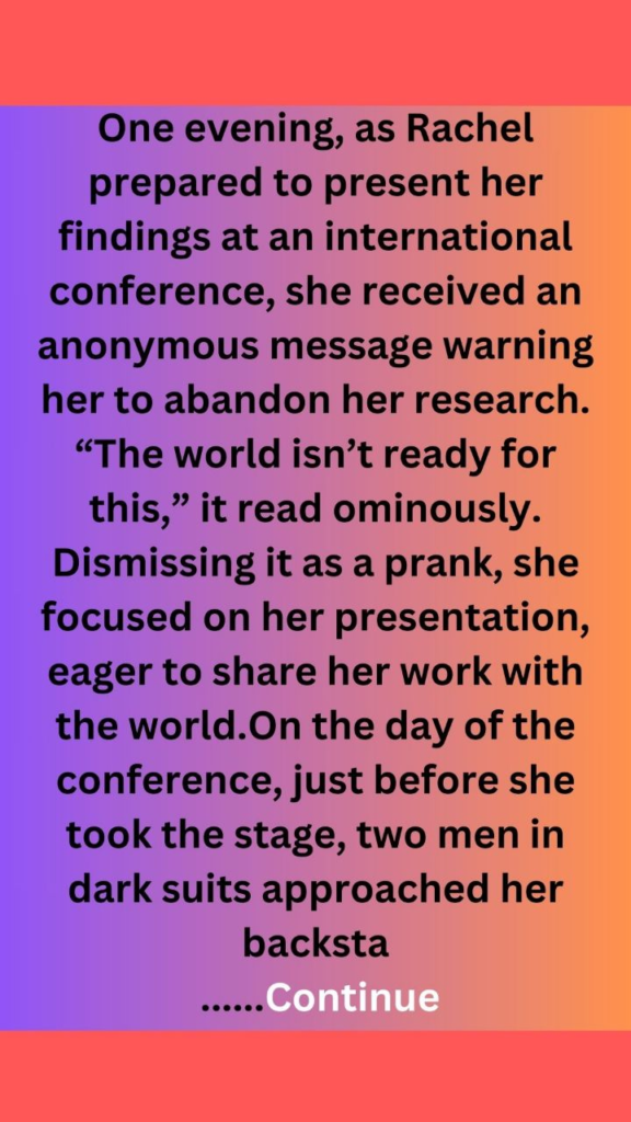 On the day of the conference, just before she took the stage, two men in dark suits approached her backstage. “Dr. Lawson,” one said, his voice low and threatening. “We need to talk.”“Who are you?” she demanded, feeling a knot tighten in her stomach.“We represent interests that extend beyond your understanding,” the other replied. “Your discovery poses a threat to our plans. You will cease all research immediately.”Fury ignited within Rachel. “You can’t silence me! This could save lives!”The men exchanged glances before one stepped closer. “Consider this a warning. If you don’t comply, you’ll regret it.”Shaken but resolute, Rachel refused to back down. She knew the implications of her work and the potential impact on humanity. As they left, she realized she was now embroiled in a dangerous game—one where the stakes were not just her career but the very future of cancer treatment.