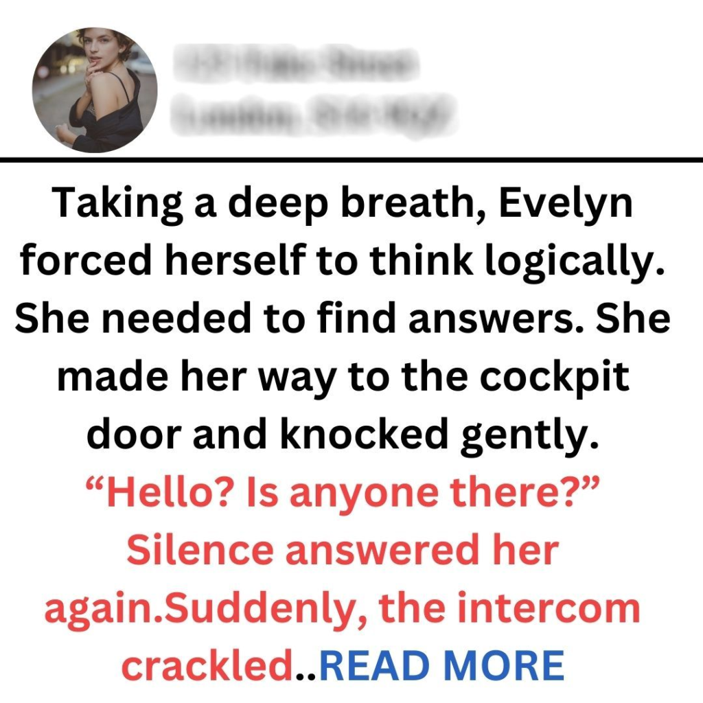 Evelyn’s thoughts spiraled as she imagined the worst-case scenarios. Had the plane landed without her? Was she trapped in some bizarre nightmare? She hurried to the emergency exit and peered out the window. Below, a vast expanse of clouds stretched endlessly into the horizon, with no signs of civilization in sight. The realization hit her: they were still in the air.She returned to her seat and grabbed her phone, but there was no signal—only a blank screen. Desperation clawed at her throat as she tried to remember what had happened before she fell asleep. The last thing she recalled was a warm meal and a glass of wine served by a friendly attendant.Taking a deep breath, Evelyn forced herself to think logically. She needed to find answers. She made her way to the cockpit door and knocked gently. “Hello? Is anyone there?” Silence answered her again.Suddenly, the intercom crackled to life, startling her. “We apologize for the inconvenience,” a calm voice said. “You are safe; we’re conducting an emergency landing.” Relief flooded through Evelyn as she realized help was on its way.