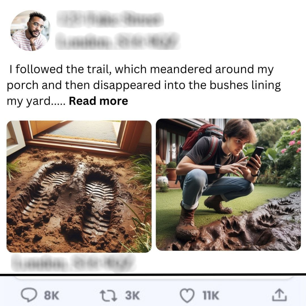 It was a quiet Saturday morning when I first noticed the strange, muddy footprints leading up to my front door. The sun had just begun to rise, casting a soft golden light across my yard, and I stepped outside with my coffee in hand, ready to enjoy the tranquility of the day. But as I approached the entrance, something caught my eye—large, muddy prints that were unmistakably out of place.The footprints were unlike any I had seen before. They were enormous, almost twice the size of my own foot, and left deep impressions in the soft earth. The mud was dark and thick, suggesting that whatever had made these prints had come from a significant distance. Curiosity quickly replaced my initial sense of unease. Who—or what—had been here?