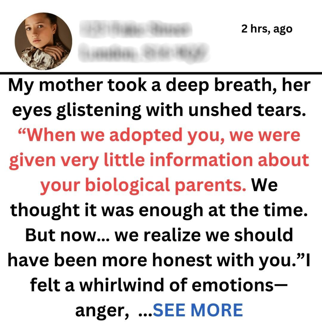 The air in the living room felt thick with tension as I sat across from my parents, the weight of their words hanging heavy in the silence. “We need to talk,” my mother had said, her voice trembling slightly. I had sensed something was off, but nothing could have prepared me for the revelation that followed.“We don’t actually know whose child you are,” my father finally admitted, his gaze avoiding mine. The room spun as I processed their confession. It was as if the ground beneath me had crumbled away, leaving me suspended in a void of confusion and disbelief.“What do you mean?” I stammered, my heart racing. “You’re my parents! You raised me!” My mind raced with memories of family vacations, birthday celebrations, and quiet evenings spent together. How could they not know?My mother took a deep breath, her eyes glistening with unshed tears. “When we adopted you, we were given very little information about your biological parents. We thought it was enough at the time. But now… we realize we should have been more honest with you.