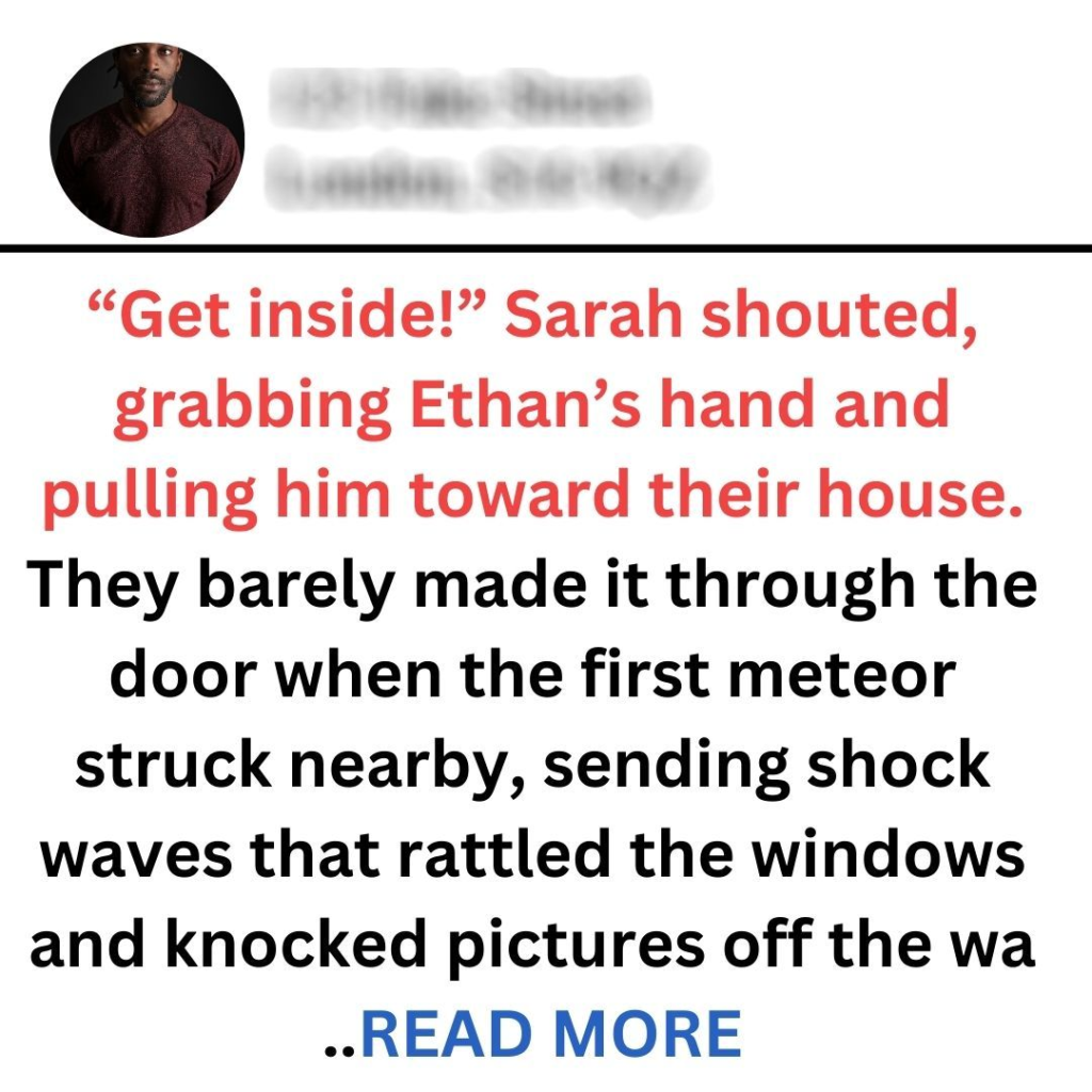 The night sky was a canvas of shimmering stars, but it quickly transformed into a scene of chaos as the first meteor streaked across the horizon. What began as a beautiful celestial display soon turned into a nightmare. The ground shook violently, and a deafening roar filled the air as dozens of meteors hurtled toward Earth, igniting the atmosphere with fiery trails.In a small town nestled in the valley, Sarah and her younger brother, Ethan, watched in awe from their backyard. “Look at that one!” Ethan exclaimed, pointing to a particularly bright meteor. But before they could fully appreciate its beauty, the ground trembled beneath them, and the sky erupted in blinding light.“Get inside!” Sarah shouted, grabbing Ethan’s hand and pulling him toward their house. They barely made it through the door when the first meteor struck nearby, sending shockwaves that rattled the windows and knocked pictures off the walls. The sound was deafening, like thunder mixed with an explosion.