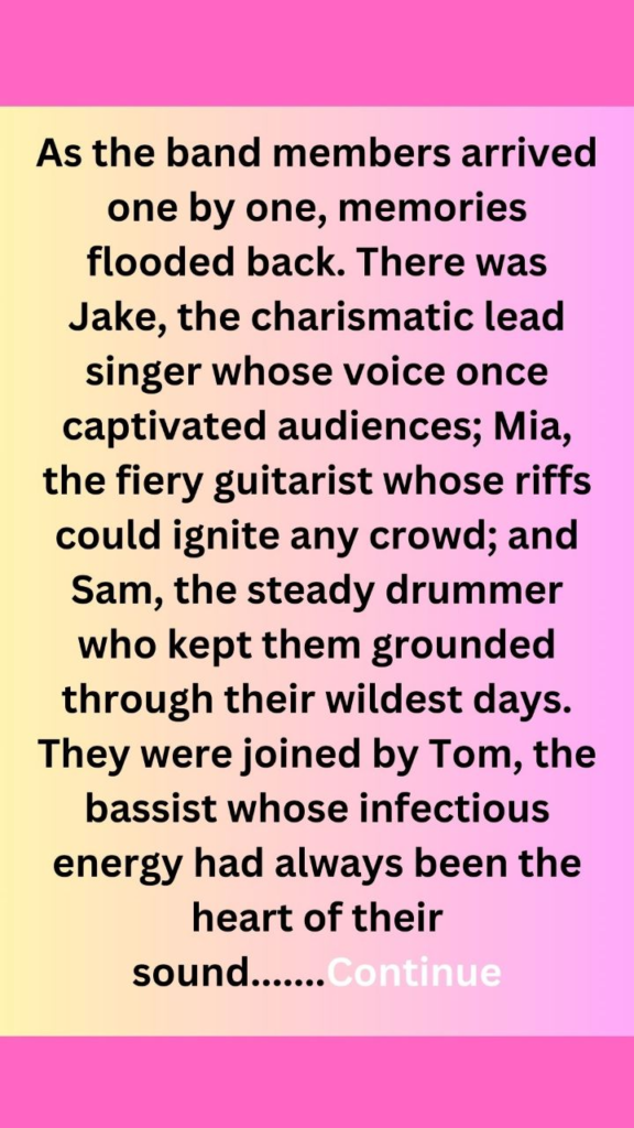 The dimly lit bar was filled with the familiar scent of aged wood and spilled beer, a nostalgic reminder of the countless nights spent playing music and sharing dreams. As the clock struck eight, the small stage at the back beckoned to the aging rock band, “The Echoes,” who had not performed together in thirty years. The anticipation in the air was palpable, a mix of excitement and trepidation.As the band members arrived one by one, memories flooded back. There was Jake, the charismatic lead singer whose voice once captivated audiences; Mia, the fiery guitarist whose riffs could ignite any crowd; and Sam, the steady drummer who kept them grounded through their wildest days. They were joined by Tom, the bassist whose infectious energy had always been the heart of their sound.After years of silence, they exchanged nervous glances and tentative smiles. “Can you believe it’s been three decades?” Mia said, her voice tinged with disbelief. “We used to think we’d be playing stadiums by now.” The others chuckled, but beneath the laughter lay a shared understanding of how life had taken them in different directions—families, careers, and responsibilities had pulled them apart.