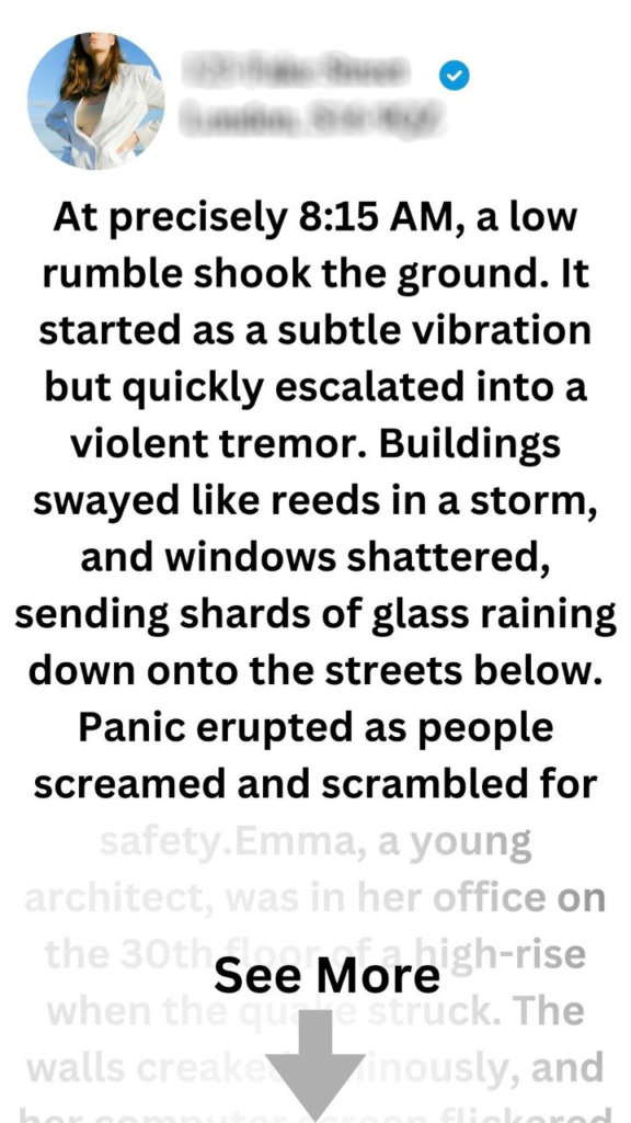 The bustling city of Metropolis was alive with energy as the sun rose, casting golden rays over skyscrapers and busy streets. People hurried to work, the sounds of honking cars and chatter filling the air. But beneath the surface, the earth was restless, a reminder of nature’s unpredictable power.At precisely 8:15 AM, a low rumble shook the ground. It started as a subtle vibration but quickly escalated into a violent tremor. Buildings swayed like reeds in a storm, and windows shattered, sending shards of glass raining down onto the streets below. Panic erupted as people screamed and scrambled for safety.Emma, a young architect, was in her office on the 30th floor of a high-rise when the quake struck. The walls creaked ominously, and her computer screen flickered wildly. She grasped her desk for support, heart racing as she watched colleagues dash toward the stairwell. “We need to get out!” someone shouted.