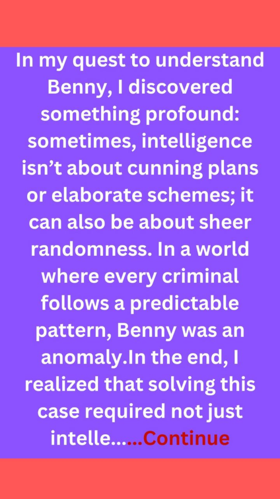 Benny taught me a valuable lesson: brilliance can sometimes be outsmarted by the absurd. In the realm of crime and detection, unpredictability can be just as formidable as intelligence.