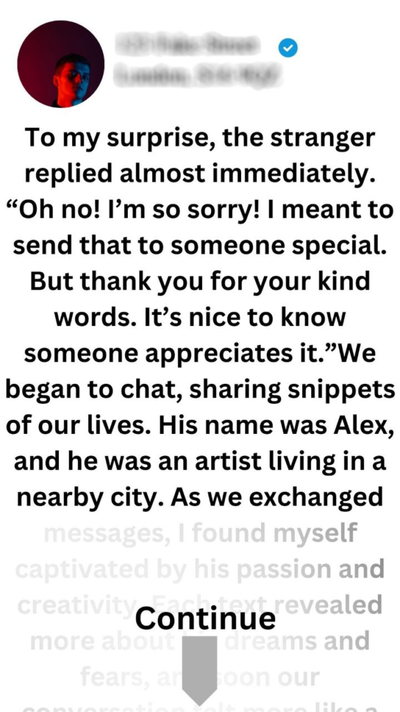 To my surprise, the stranger replied almost immediately. “Oh no! I’m so sorry! I meant to send that to someone special. But thank you for your kind words. It’s nice to know someone appreciates it.”We began to chat, sharing snippets of our lives. His name was Alex, and he was an artist living in a nearby city. As we exchanged messages, I found myself captivated by his passion and creativity. Each text revealed more about his dreams and fears, and soon our conversation felt more like a connection than a mere mistake.