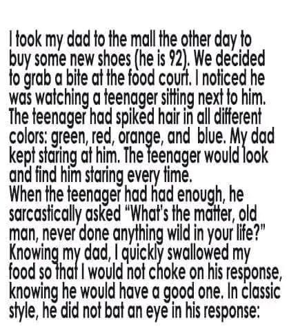 As we waited, Dad noticed a teen nearby with hair styled into bright, wild spikes—green, red, orange, blue. My dad kept glancing over, clearly amused. Finally, the teen called out, “What’s the matter, old man? Never done anything wild in your life?”