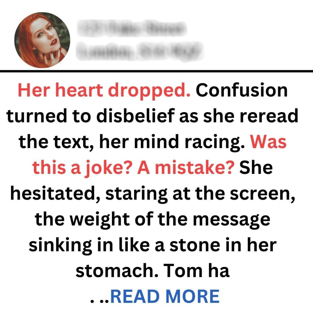 It was a typical Wednesday evening when Sarah settled onto the couch, ready to unwind after a long day at work. She scrolled through her phone, catching up on messages from friends, when a notification popped up from her husband, Tom. The message read: “Can’t wait to see you tonight. I’ll make sure my wife is out of the house.”Her heart dropped. Confusion turned to disbelief as she reread the text, her mind racing. Was this a joke? A mistake? She hesitated, staring at the screen, the weight of the message sinking in like a stone in her stomach. Tom had always been a devoted husband, or so she thought.Taking a deep breath, Sarah decided to confront him. She felt a mix of anger and hurt bubbling up inside her. “Tom, we need to talk,” she called out, trying to keep her voice steady.
