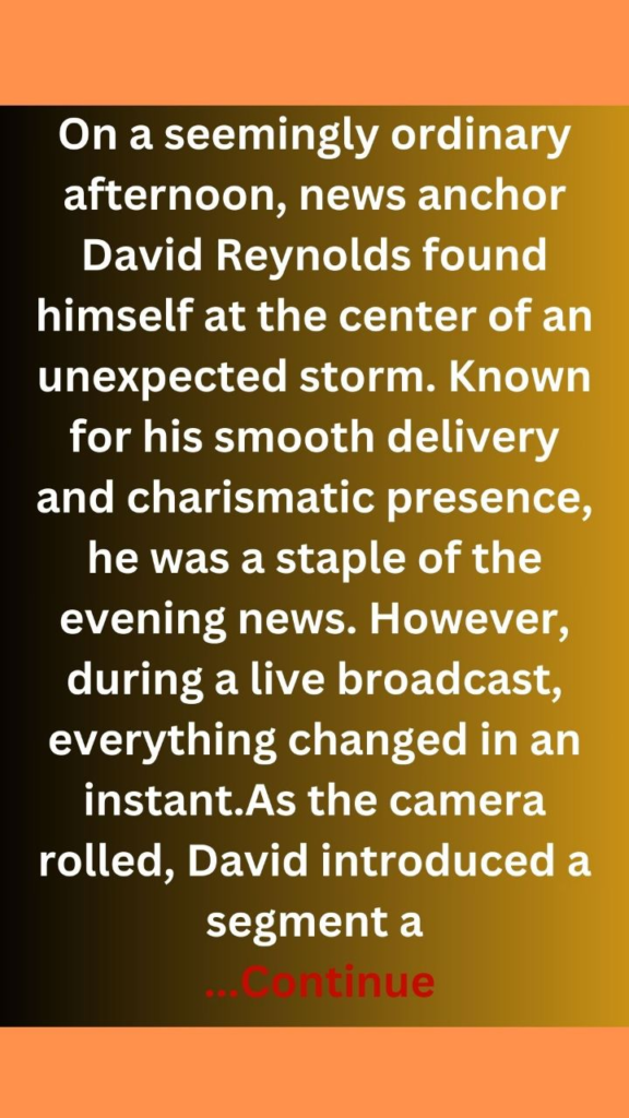On a seemingly ordinary afternoon, news anchor David Reynolds found himself at the center of an unexpected storm. Known for his smooth delivery and charismatic presence, he was a staple of the evening news. However, during a live broadcast, everything changed in an instant.As the camera rolled, David introduced a segment about local charity events. Just as he began to speak, he suddenly froze. The words caught in his throat, and his mind went blank. Viewers watched in bewilderment as he stared into the camera, his expression shifting from confusion to panic. Seconds felt like hours as the silence stretched on, creating an awkward void that filled living rooms across the city.Behind the scenes, producers scrambled to regain control. A graphic flashed on the screen, attempting to distract viewers from the uncomfortable moment unfolding. But it was too late; social media exploded with clips and comments about David’s unexpected freeze.