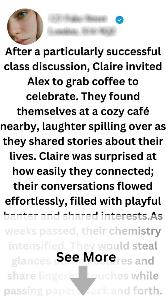 As weeks passed, their chemistry intensified. They would steal glances during lectures and share lingering touches while passing papers back and forth. One evening, while grading assignments in her office, Claire caught Alex’s gaze lingering on her lips. The air thickened with unspoken tension as they leaned closer, their hearts racing.In that moment of vulnerability, they kissed—a soft brush of lips that ignited a fire between them. What started as a fleeting moment turned into an undeniable attraction that neither could resist. They began meeting after hours, their stolen moments filled with passion and laughter.But as the semester progressed, reality loomed over them like a dark cloud. Claire knew the implications of their relationship; it could jeopardize her career and Alex’s future. They discussed their feelings openly, torn between desire and professionalism.One evening, after a particularly heated discussion about their future, Claire took a step back. “We need to think about what this means for both of us,” she said softly.Alex nodded, his expression serious yet understanding. “I care about you too much to let this ruin what we have.”