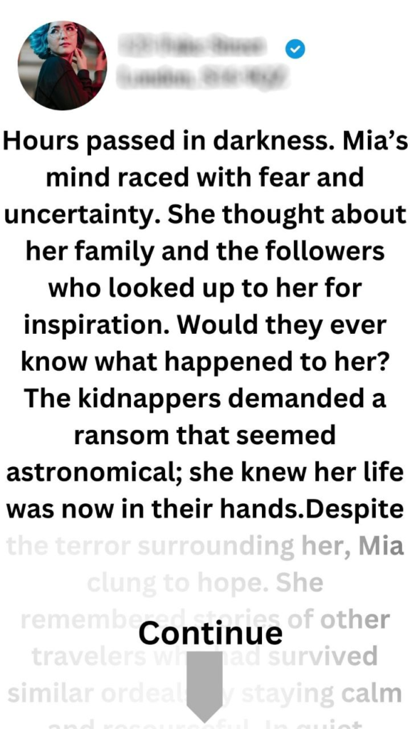 Hours passed in darkness. Mia’s mind raced with fear and uncertainty. She thought about her family and the followers who looked up to her for inspiration. Would they ever know what happened to her? The kidnappers demanded a ransom that seemed astronomical; she knew her life was now in their hands.Despite the terror surrounding her, Mia clung to hope. She remembered stories of other travelers who had survived similar ordeals by staying calm and resourceful. In quiet moments, she began formulating a plan. She would use her knowledge of social media to reach out for help if given the chance.Days turned into an eternity until one fateful night when one of the kidnappers left the door slightly ajar. Seizing the opportunity, Mia slipped out into the night, heart pounding as she navigated through unfamiliar streets.