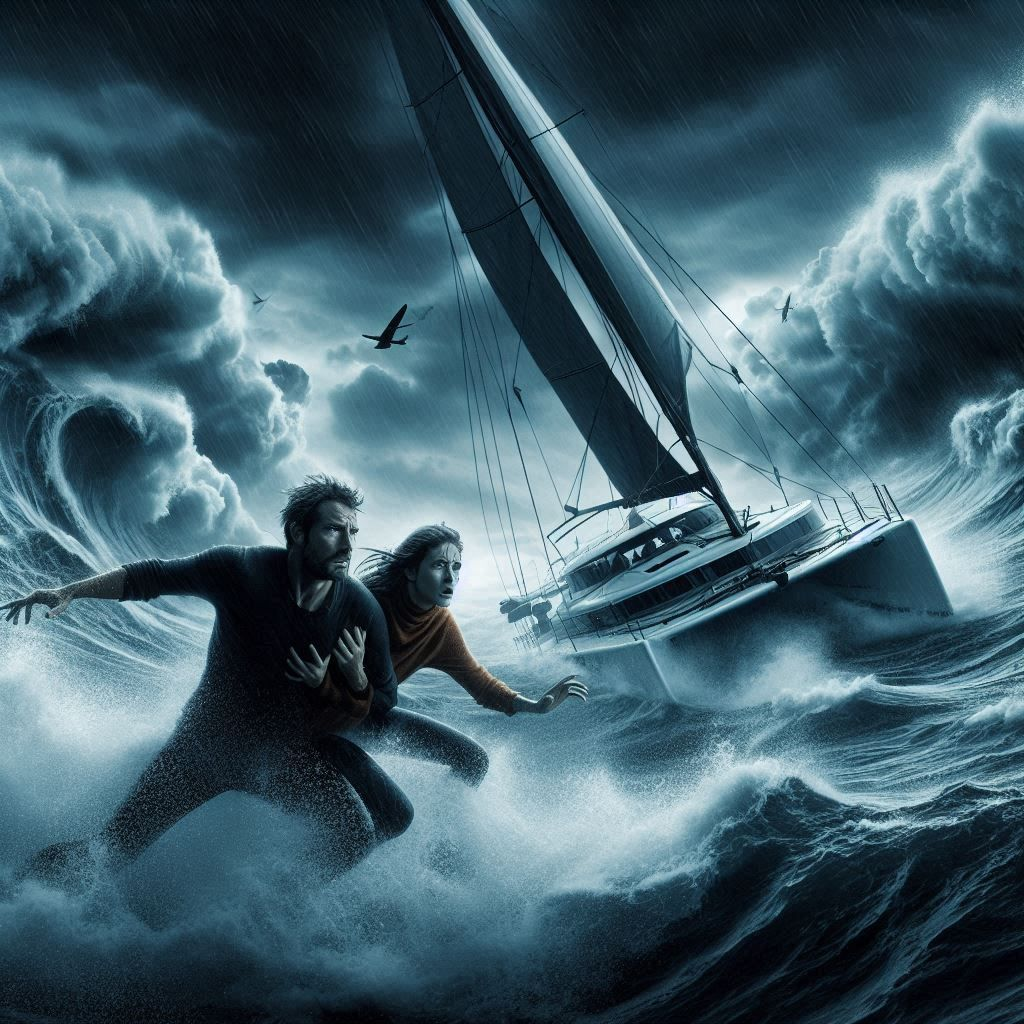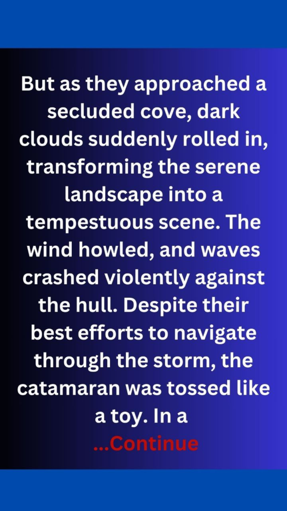 The sun hung high in the sky, casting a golden glow over the turquoise waters of the Caribbean. Sarah and Mark had been looking forward to this anniversary trip for months, eager to celebrate their love aboard a sleek catamaran. As they sailed through the shimmering waves, laughter filled the air, blending with the gentle sound of the ocean.But as they approached a secluded cove, dark clouds suddenly rolled in, transforming the serene landscape into a tempestuous scene. The wind howled, and waves crashed violently against the hull. Despite their best efforts to navigate through the storm, the catamaran was tossed like a toy. In a heart-stopping moment, it capsized, sending Sarah and Mark tumbling into the churning sea.When they finally emerged from the water, gasping for breath, they found themselves washed ashore on a small, uninhabited island. Dazed but unharmed, they took stock of their surroundings. Palm trees swayed gently in the breeze, and vibrant flowers dotted the sandy beach. It was eerily beautiful, but panic began to set in.“