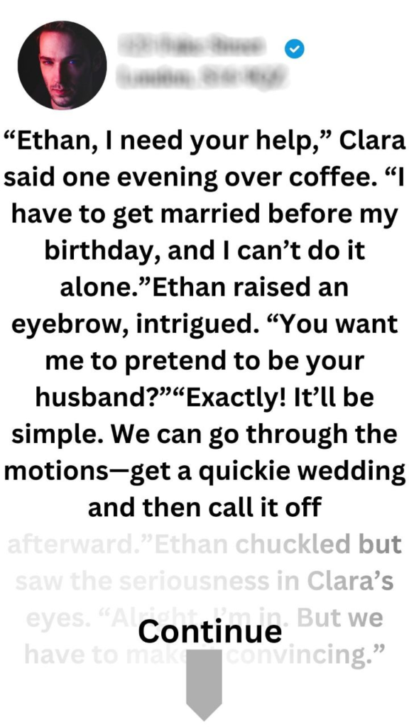 As the clock ticked down to her thirtieth birthday, Clara Matthews felt the weight of her family’s expectations pressing down on her like a heavy shroud. Her late grandfather had left behind a peculiar clause in his will: she must be married by her birthday or forfeit her substantial inheritance. With just weeks to go, Clara found herself in a race against time.Clara had always been fiercely independent, focusing on her career as an architect rather than settling down. The thought of hastily marrying someone felt foreign and absurd. Yet, the prospect of losing her grandfather’s hard-earned fortune was too daunting to ignore. She decided to enlist the help of her best friend, Ethan, a charming and easygoing guy who had always been there for her.“Ethan, I need your help,” Clara said one evening over coffee. “I have to get married before my birthday, and I can’t do it alone.”Ethan raised an eyebrow, intrigued. “You want me to pretend to be your husband?”“Exactly! It’ll be simple. We can go through the motions—get a quickie wedding and then call it off afterward.”