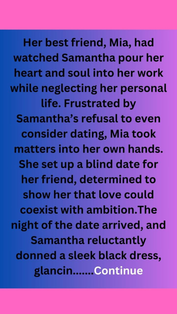 Samantha Reed was a force to be reckoned with in the corporate world. As the CEO of a thriving marketing firm, she was known for her sharp mind and relentless ambition. Love was a distraction she couldn’t afford; her focus was solely on climbing the corporate ladder. “I’ll never find love,” she often declared to her colleagues, who rolled their eyes at her stubbornness.Her best friend, Mia, had watched Samantha pour her heart and soul into her work while neglecting her personal life. Frustrated by Samantha’s refusal to even consider dating, Mia took matters into her own hands. She set up a blind date for her friend, determined to show her that love could coexist with ambition.The night of the date arrived, and Samantha reluctantly donned a sleek black dress, glancing at herself in the mirror. “This is ridiculous,” she muttered, but deep down, a flicker of curiosity ignited. When she arrived at the upscale restaurant, she spotted a tall figure waiting at the bar—Ethan, a charming entrepreneur with an easy smile.