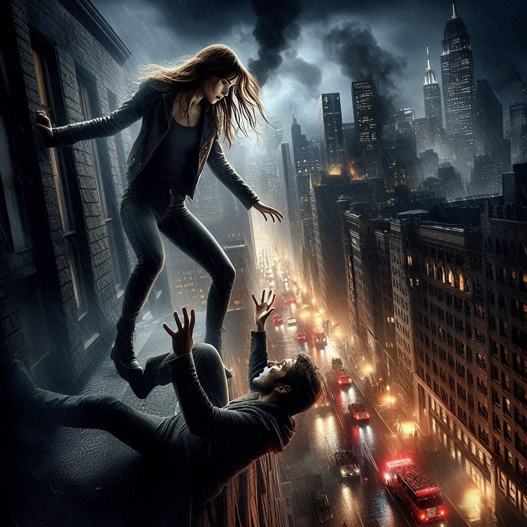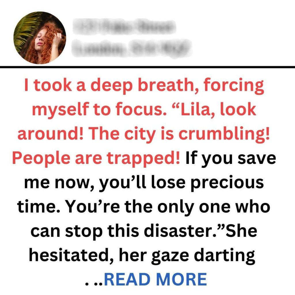 The city was in chaos. Sirens wailed in the distance, and the ground trembled beneath the weight of destruction. I stood on the rooftop, heart racing, facing the woman who had captivated my heart—Lila, the fearless heroine who had saved countless lives. But now, as she prepared to leap into action, I found myself in a precarious position.“Lila!” I shouted, my voice barely cutting through the cacophony. She turned, her eyes fierce and determined, but there was a flicker of concern when she saw me hanging from the ledge. “You have to listen to me!”“Hold on! I’m coming!” she cried, her instincts kicking in as she moved closer.“No!” I gasped, straining against the pain in my arms. “You can’t save me. You have to save the city!”Her brow furrowed with confusion. “What are you talking about? I won’t leave you!”