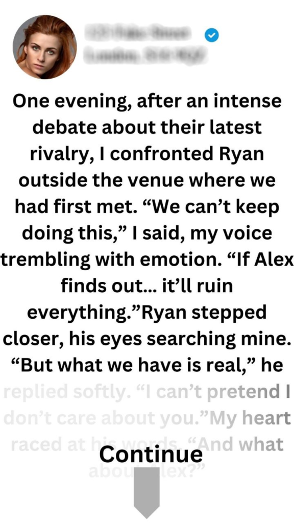 One evening, after an intense debate about their latest rivalry, I confronted Ryan outside the venue where we had first met. “We can’t keep doing this,” I said, my voice trembling with emotion. “If Alex finds out… it’ll ruin everything.”Ryan stepped closer, his eyes searching mine. “But what we have is real,” he replied softly. “I can’t pretend I don’t care about you.”My heart raced at his words. “And what about Alex?”“He’s my rival, but you’re not just collateral damage,” he insisted. “You deserve happiness.”Torn between love and loyalty, I felt tears welling up. “I don’t want to hurt him.”“Then let’s find a way to make this work,” Ryan urged, reaching for my hand.
