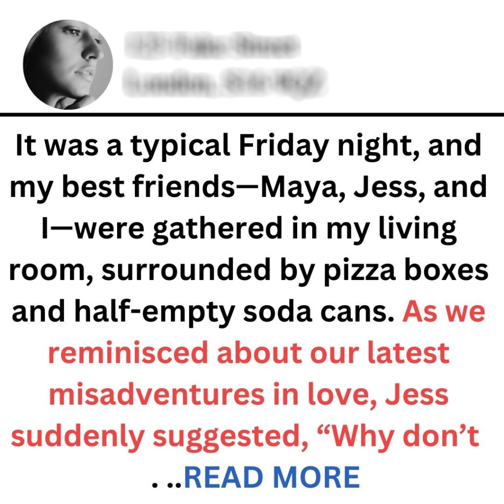 It was a typical Friday night, and my best friends—Maya, Jess, and I—were gathered in my living room, surrounded by pizza boxes and half-empty soda cans. As we reminisced about our latest misadventures in love, Jess suddenly suggested, “Why don’t we try that new dating app everyone’s talking about?”I raised an eyebrow, glancing at Maya. “You mean the one that promises to match you based on your personality and interests?”“Exactly!” Jess replied, her eyes sparkling with excitement. “What do we have to lose? We’re all single and ready for some fun!”After a moment of hesitation, I nodded. “Alright, let’s do it! But only if we can create our profiles together.”