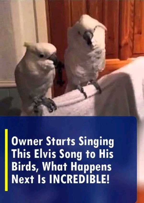 In a delightful video, a man sings Elvis Presley’s “Don’t Be Cruel” to his cockatoos, showcasing their unexpected musical talent. One bird bobs its head to the beat, while another surprises viewers with an amazing reaction. The heartwarming moment highlights the bond between the owner and his feathered friends, making it a must-watch for any Elvis fan or animal lover.