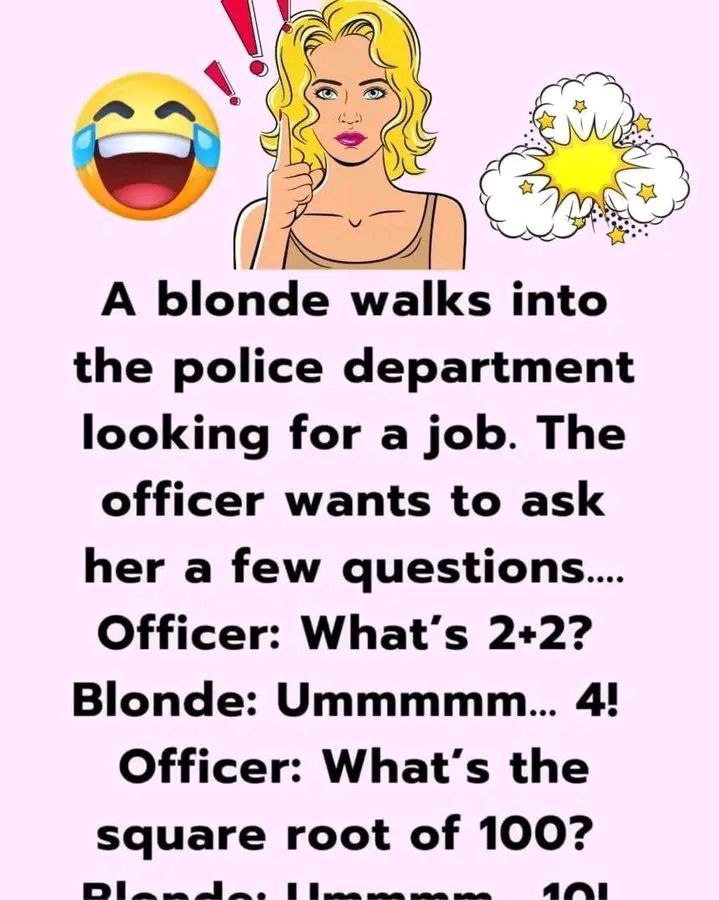 The story is a light-hearted joke about a blonde woman seeking a job at a police department. During the interview, the officer asks her some simple questions: