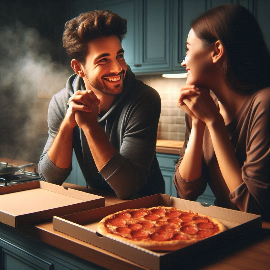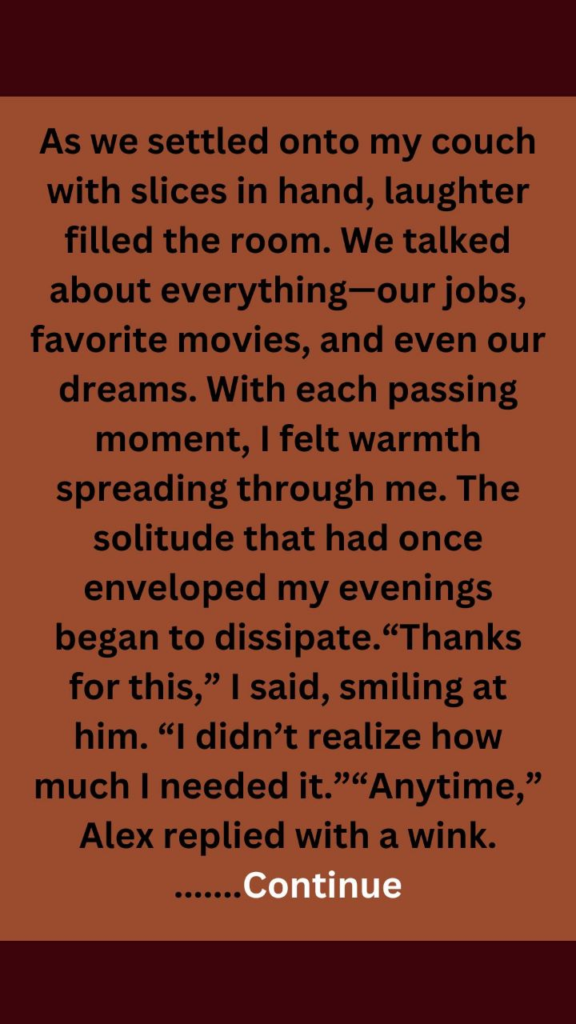 “Surprise!” he said cheerfully. “I thought you might want some company tonight.”My mind raced. Alex had always been friendly but never this friendly. “Um… hey! What are you doing here?” I stammered, trying to process the unexpected turn of events.“I figured you could use a break from cooking,” he replied, setting the boxes on the counter. “And honestly, I was craving pizza too.”As we settled onto my couch with slices in hand, laughter filled the room. We talked about everything—our jobs, favorite movies, and even our dreams. With each passing moment, I felt warmth spreading through me. The solitude that had once enveloped my evenings began to dissipate.“Thanks for this,” I said, smiling at him. “I didn’t realize how much I needed it.”“Anytime,” Alex replied with a wink. “Just remember to save some pizza for your ‘honey’ next time!”