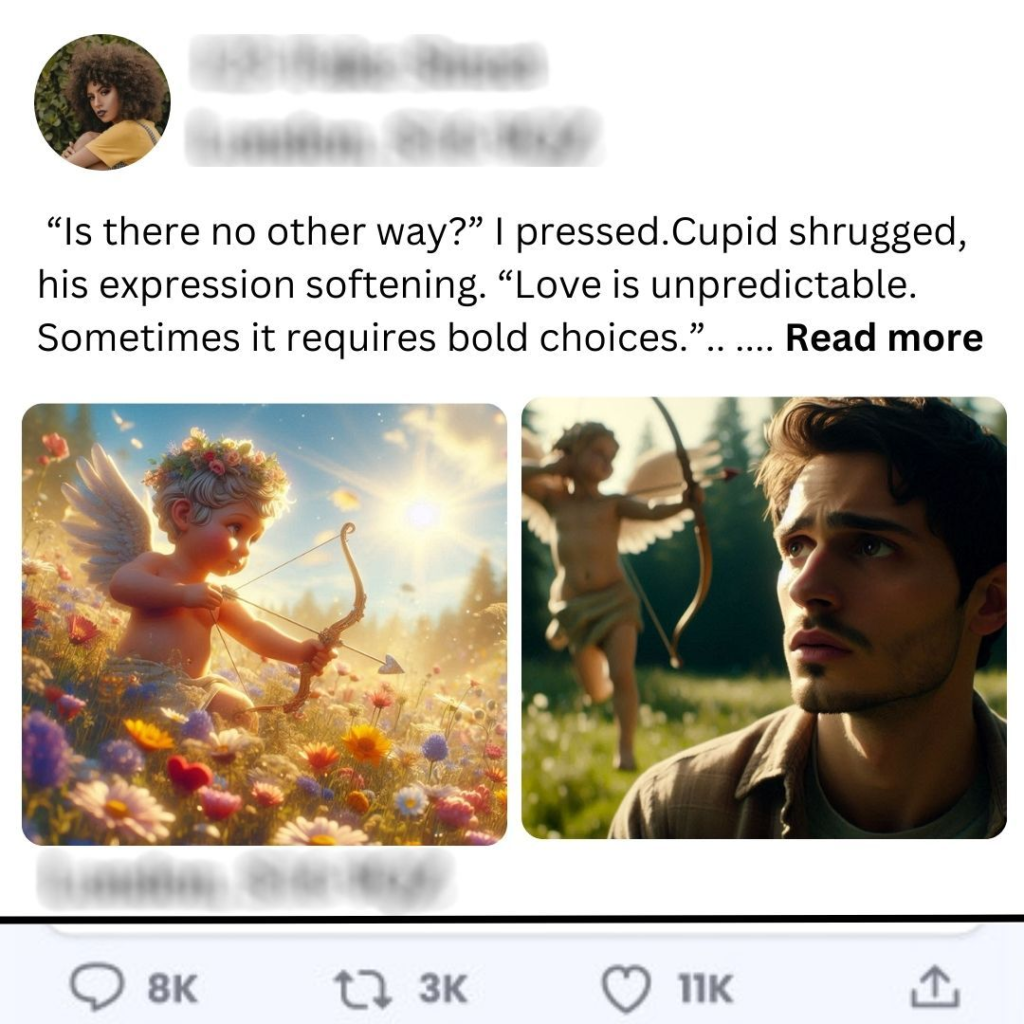 With a swift motion, Cupid drew back his bow and released the arrow with a twang that echoed through the meadow. It sailed through the air, glowing like a comet before finding its mark—right in Alex’s heart.In that instant, I felt a wave of uncertainty wash over me. Would this be worth it? As I turned to face Alex, who was approaching with a curious smile, I realized that whatever happened next would change everything.As he drew closer, I held my breath, waiting for the magic to unfold—or for everything to come crashing down. The moment felt suspended in time; love hung in the balance between friendship and something more profound.