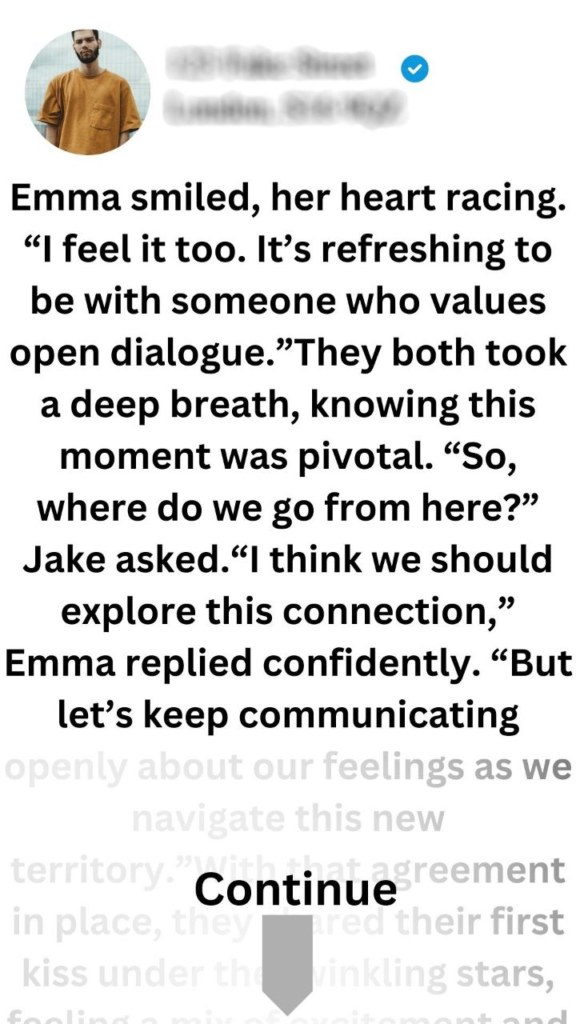 Weeks turned into months, and their friendship blossomed into something deeper. One evening, while strolling through a park, Jake stopped and turned to Emma. “You know, I’ve been thinking about how we communicate,” he began, his tone serious yet warm. “I feel like we have something special here.”Emma smiled, her heart racing. “I feel it too. It’s refreshing to be with someone who values open dialogue.”They both took a deep breath, knowing this moment was pivotal. “So, where do we go from here?” Jake asked.“I think we should explore this connection,” Emma replied confidently. “But let’s keep communicating openly about our feelings as we navigate this new territory.”With that agreement in place, they shared their first kiss under the twinkling stars, feeling a mix of excitement and comfort.As their relationship flourished, they faced challenges with grace—disagreements were met with understanding rather than defensiveness. They learned to appreciate the little quirks that made each other unique.One day, while planning a weekend getaway, Emma looked at Jake and said, “You know what? I love how we can talk about anything without fear.”