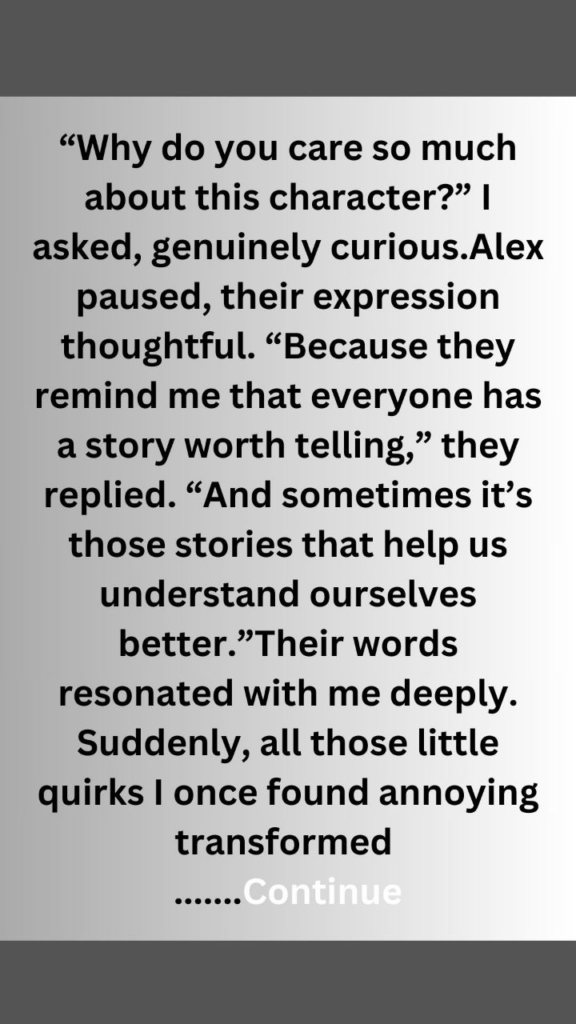 “Why do you care so much about this character?” I asked, genuinely curious.Alex paused, their expression thoughtful. “Because they remind me that everyone has a story worth telling,” they replied. “And sometimes it’s those stories that help us understand ourselves better.”Their words resonated with me deeply. Suddenly, all those little quirks I once found annoying transformed into qualities I admired. I began to appreciate Alex’s spontaneity and passion for life.