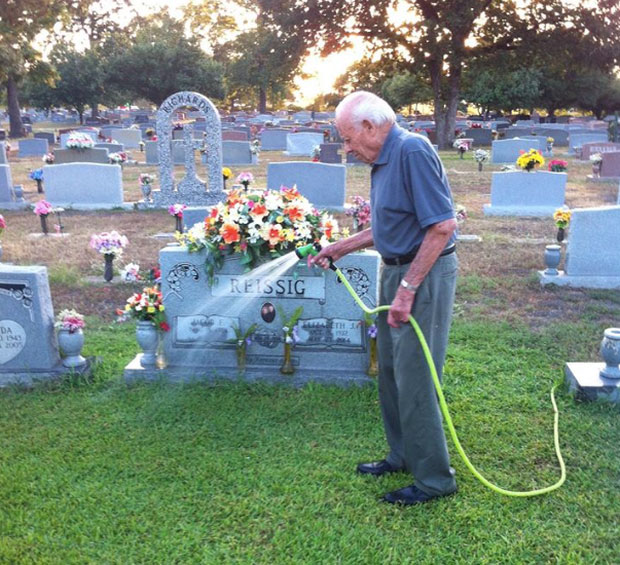 He asked her and she told the story of the sergeant. Jake wanted to show that he cared.He decided to water the grass every day and bring flowers to the soldier’s grave