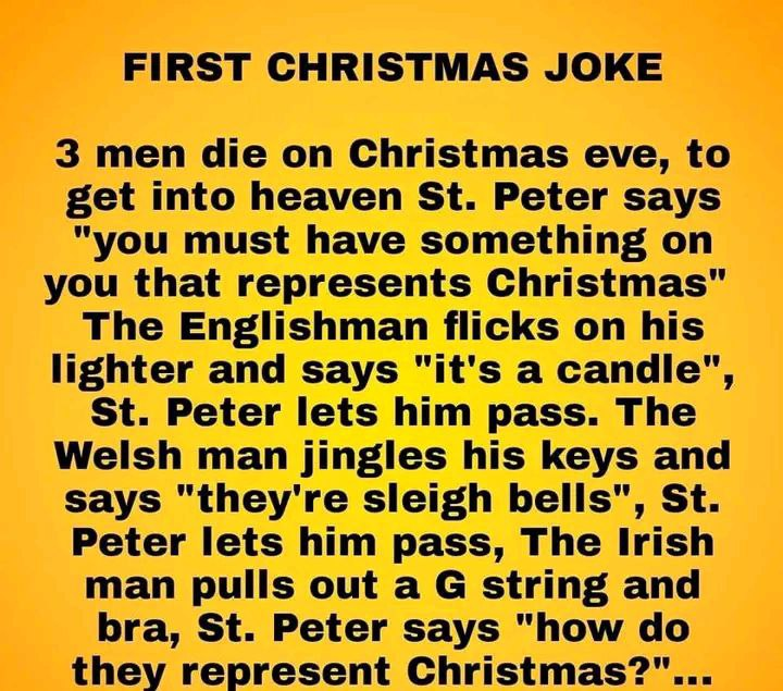 When the Irishman pulls out a G-string and bra, St. Peter asks how they represent Christmas. The Irishman replies, “They’re Carols,” referencing the traditional Christmas carolers.