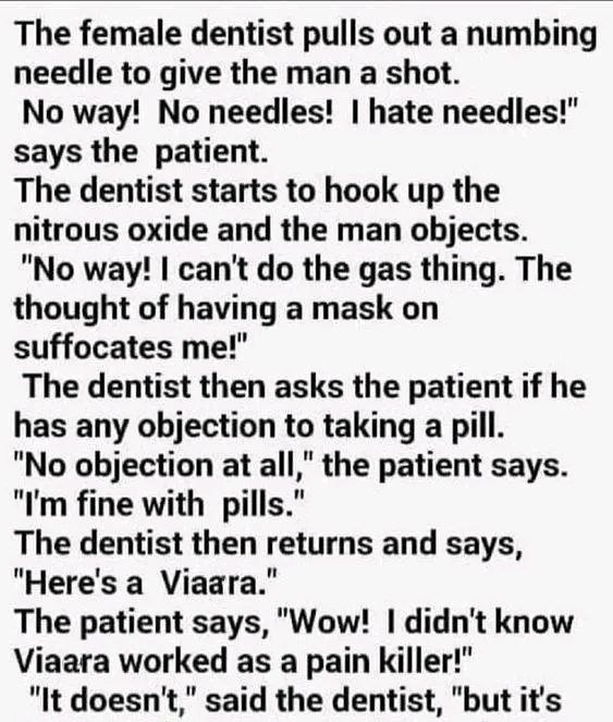 The patient says, “Wow! I didn’t know Viagra worked as a pain killer!”