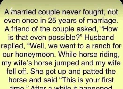 The article tells a humorous story about a married couple who reportedly never fought in 25 years of marriage. When asked how that was possible, the husband recounts their honeymoon at a ranch. While riding horses, the wife’s horse threw her off three times. After the third fall, she shot the horse, and when the husband expressed outrage, she calmly responded, “This is your first time.” The story highlights the wife’s calm and decisive nature, with the husband seemingly accepting her actions as part of the reason they never fought.