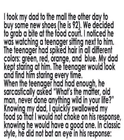 A 92-year-old man had a hilarious and unexpected reaction when he spotted a teenager with wild hair at the mall food court. While having lunch with his child, the elderly dad couldn’t resist commenting on the teenager’s bold hairstyle. With perfect timing and classic grandad humor, he turned to the teenager and said, “I see you got your hair styled by a tornado!” The teen, caught off guard, couldn’t help but laugh, and the whole situation turned into a heartwarming moment of cross-generational humor. This funny encounter is a perfect example of how a sharp sense of humor can bridge the age gap and leave everyone in stitches!