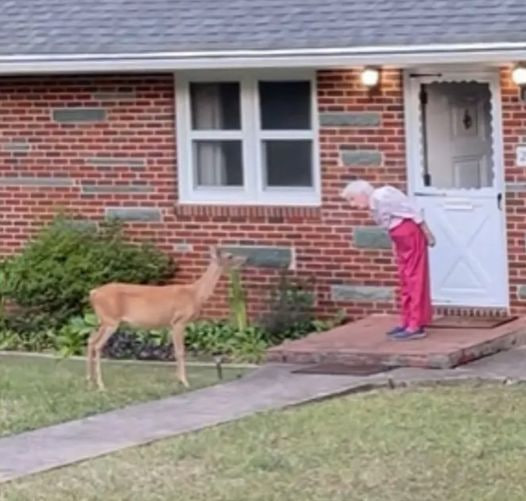 While standing on her front porch, the elderly neighbor was surprised when a deer walked up to her. With a smile on her face, she excitedly pointed at the deer, reaching out to it, but maintaining a respectful distance. The two shared a quiet, intimate moment, simply gazing at each other.