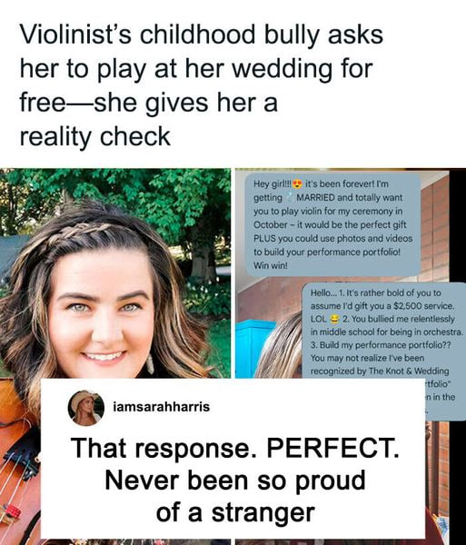 Years later, her former bully reached out, asking Tiffany to play violin at her wedding for free, claiming it would be a “perfect gift” and help Tiffany build her portfolio. Tiffany, now a successful wedding musician recognized by The Knot, was not interested in helping her former bully. In a direct response, she pointed out the audacity of the request and reminded her bully of the years of torment she endured.
