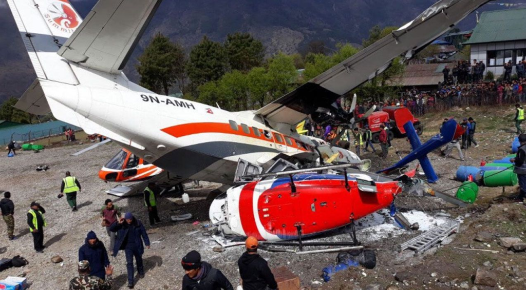 A Summit Air plane, identified as 9N-AMH, crashed at Lukla Airport in Nepal, colliding with a stationary helicopter. The incident occurred shortly after takeoff when the small twin-engine L-410 Turbolet lost control and veered off the runway. CCTV footage of the crash has been submitted to local authorities for investigation.Reports indicate that the pilot survived the crash, but tragically, the co-pilot and two individuals on the ground did not. The airport director expressed concern for the well-being of those affected by this unfortunate event.