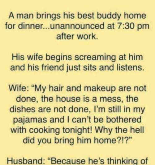 The wife exclaims, “I’m not ready! My hair and makeup are a mess, the house is dirty, the dishes aren’t done, I’m still in my pajamas, and I don’t feel like cooking! Why would you bring him home without telling me first?”