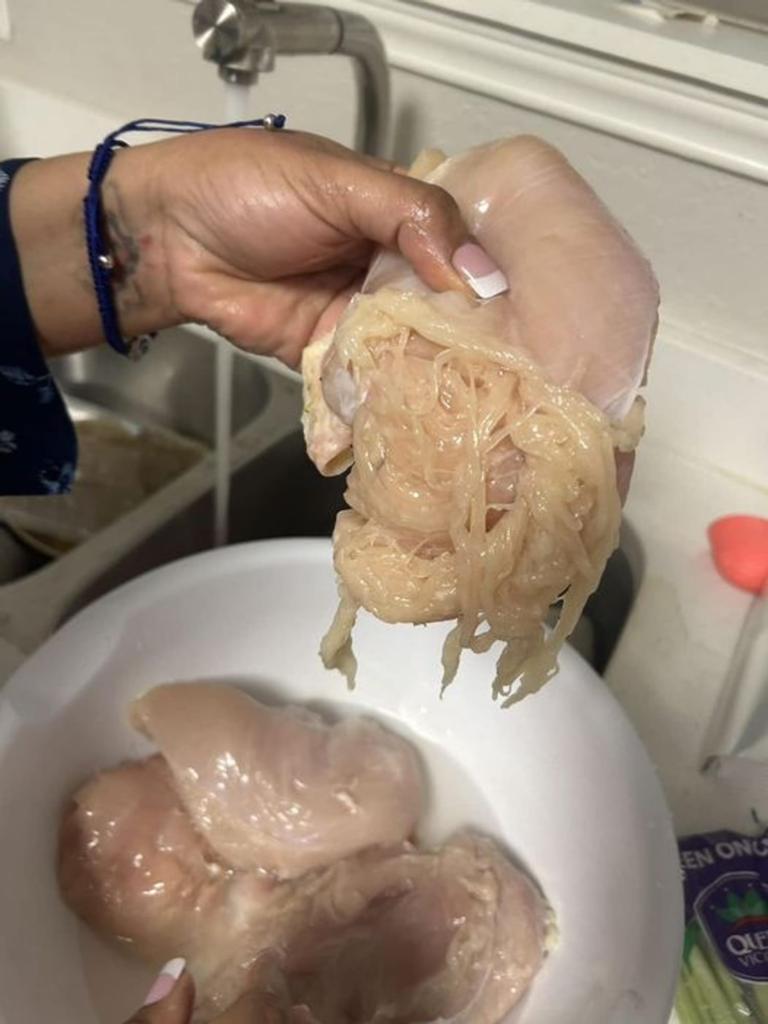 Alesia Cooper, a mother from Irving, Texas, shared a photo of a chicken breast she purchased, which unexpectedly shredded into thin strands resembling spaghetti while cooking. She noted that the meat was from Aldi, and speculated it might be “fake meat,” unsure of the cause.