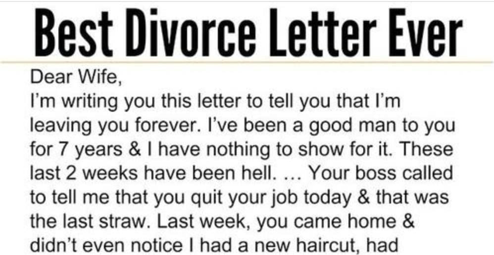A man’s dramatic divorce letter to his wife turned into an unexpected comedy when she replied with her own letter that left him stunned and regretful. The man’s letter, full of complaints about his wife’s actions, culminated in him telling her that he was leaving her forever. He mentioned everything from his new haircut to her lack of affection and her quitting her job. He also threatened that he and her sister were moving to West Virginia.